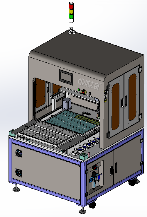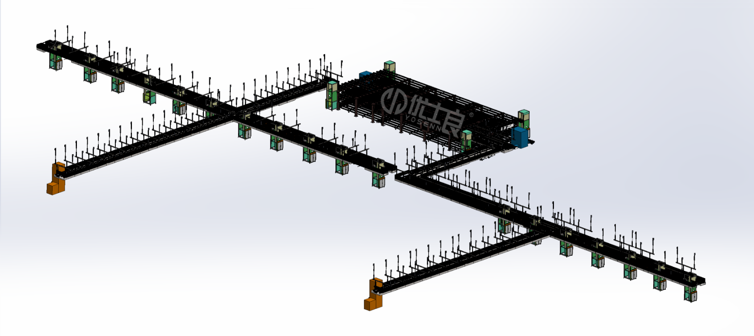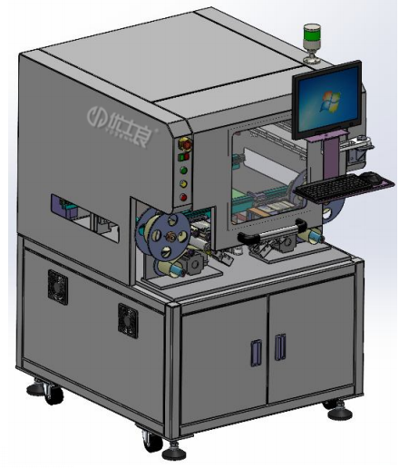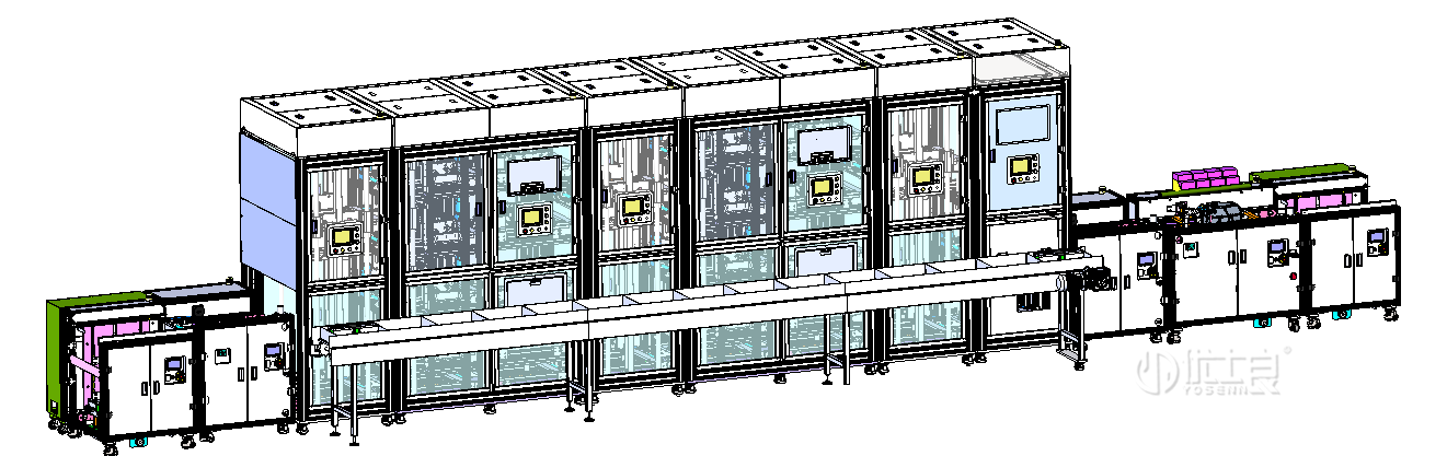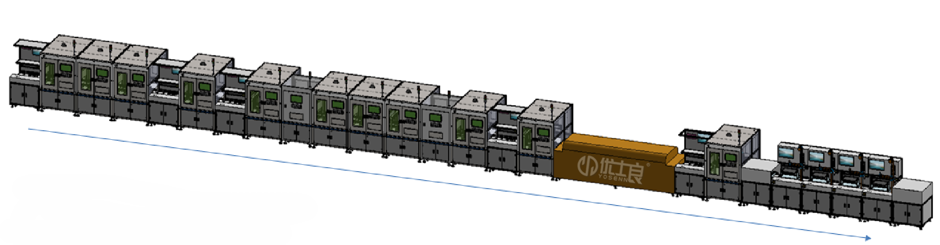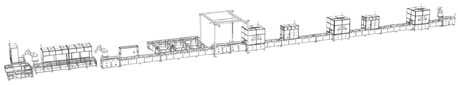 The inverter controller KB assembly line is fed by material carts, with a robotic arm grasping the KB assembly, automatically locking screws and applying labels, and then diverting it to the testing area for testing. During the testing process, there are actions such as pressing buttons and rotating knobs to perform relevant tests. It operates fully automatically, maximizing the monitoring of production data and mixed-line production.